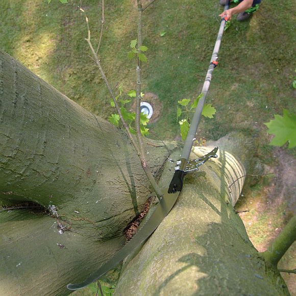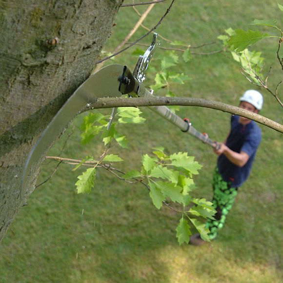 Die Raupenschere verfügt über ein einzigartiges Doppelrollensystem und einen dreifachen Verriegelungsmechanismus für leichtes Schneiden selbst dicker Äste. Meistverkaufte japanische Teleskopsägen für den Baumschnitt in Höhen. Die super grobe Verzahnung ist ideal für den Schnitt großer Bäume. Oval geformte Aluminium-Stange für präzise Kontrolle über die Ausrichtung des Sägeblatts und erhöhte Steifigkeit. Sie ermöglichen eine genaue Kontrolle über die Säge beim Schneiden in großen Höhen. Der komfortable und vibrationsdämpfende Griff ermöglicht einen sicheren Halt. Das Sägeblatt ist 390 mm lang und kann in zwei verschiedenen Positionen für einen tieferen oder höheren Schnitt eingestellt werden. Das Sägeblatt ist gebogen und an Enden mit zwei Sicheln versehen. Die untere Sichel sorgt für einen sauberen Schnitt und die obere verhindert, dass die Säge aus dem Schnitt rutscht. Die Teleskopteile sind mit Sicherungsstiften und Schnellspannern ausgestattet, die eine schnelle und sichere Einstellung der gewünschten Länge ermöglichen. Die Zähne sind so geschliffen, dass sie wie ein 4-reihiges Verzahnungsprofil aussehen. Es handelt sich um einen Silky Spezialschliff für den anspruchsvollen Grobschnitt von Bäumen. Die Zähne können nachgeschärft werden.