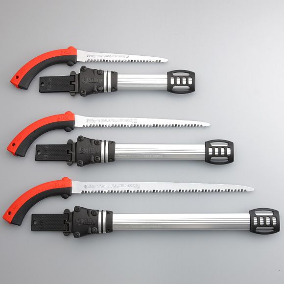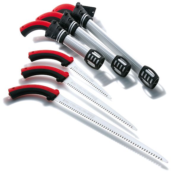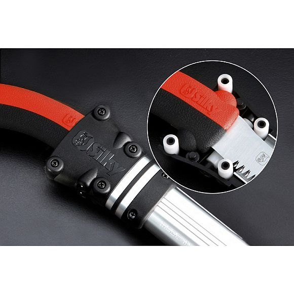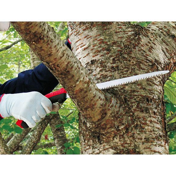 Tsurugi Astsägen sind in 3 Längen (Sägeblatt 200, 300 und 400 mm) und mit grober oder mittlerer Verzahnung erhältlich. Die wirklich sehr schmale Blattbreite macht diese Säge ideal für die Beschneidungen in Bereichen mit sehr dichter Vegetation. Der Gummigriff besteht aus zwei Teilen ohne Schrauben oder Bolzen und kann ohne Werkzeuge entfernt und das Blatt gewechselt werden. Zum Lieferumfang gehört ein Schutzhalfter mit Gürtellasche. Das Halfter ist mit sechs Rollen versehen, damit die Sägezähne die Schutzhülle nicht beschädigen beim Herausziehen oder Hineinführen. Die Tsurugi ist eine einzigartige Säge, die dank der Qualität des Materials in Verbindung mit einer speziell geschliffenen Schneidkante und einem langlebigen, extra schmalem Sägeblatt problemlos hartes und weiches Holz an Orten mit wenig Platz schneidet.