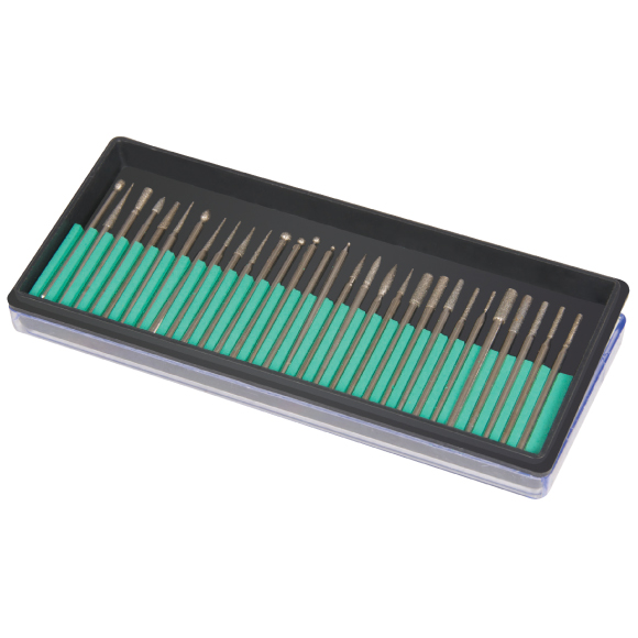 Das große Set enthält 30 Diamantfräser mit einer Rauheit von 150 und einem festen Schaft von 2,35 mm oder 3,2 mm.