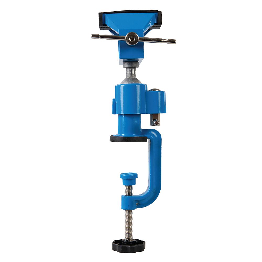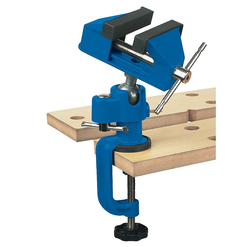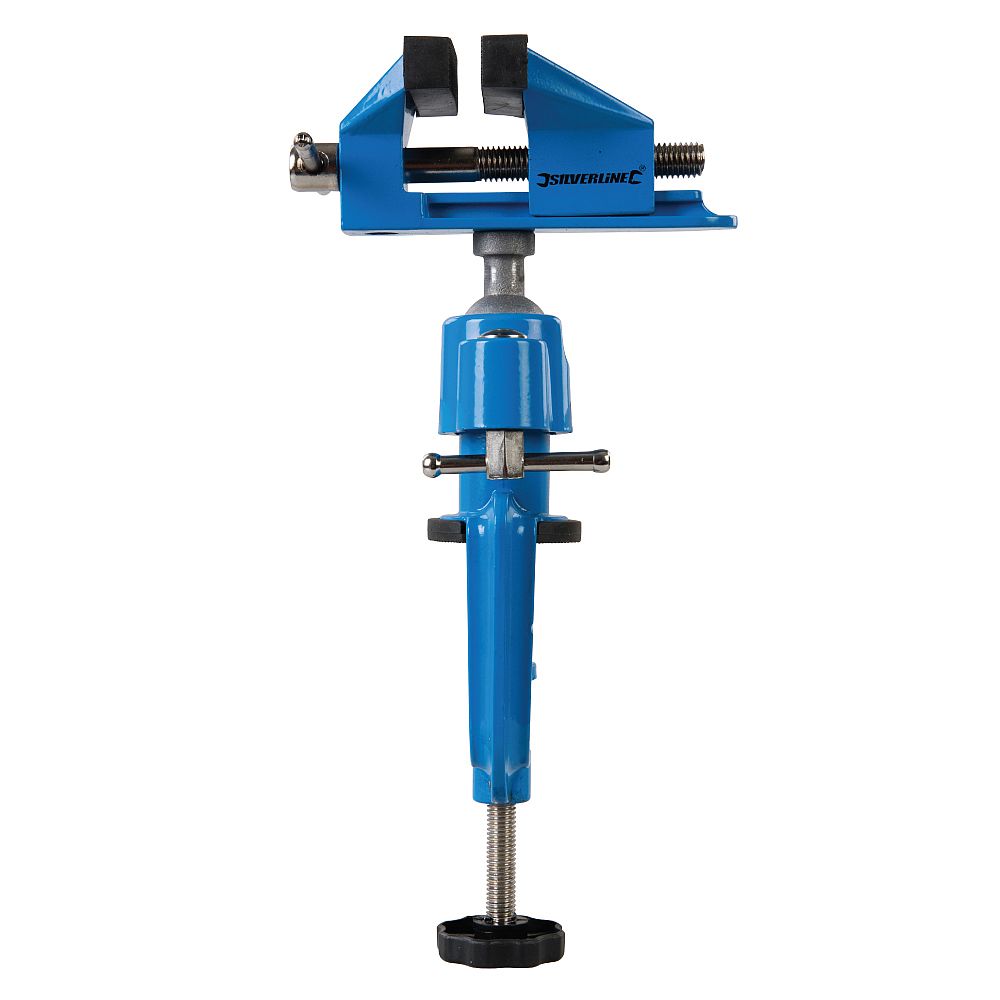 Positionierbarer Schraubstock mit korrosionsbeständiger Guss-Konstruktion. 70 mm Gummibacken mit 50 mm Backenweite zum Spannen von Gegenständen ohne sie zu beschädigen.