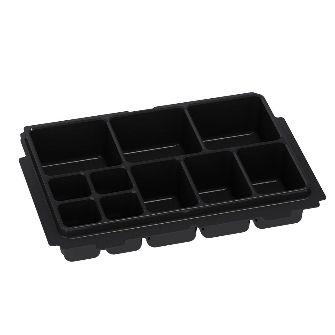 Tiefzieheinlage mit 10 unterschiedlich großen Fächern. Geeignet zum Sortieren von Kleinteilen wie z.B. Schrauben, Muttern, Unterlegscheiben, usw.