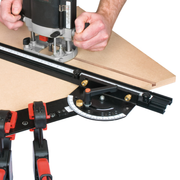 Die einstellbare Führungsschiene ermöglicht exakte Führung von Handkreissäge, Oberfräse oder Stichsäge. Frei einstellbarer Winkeleinstellbereich von 25° bis 155° Voreingestellte Winkelrasterung bei: 30°, 45°, 60°, 90°, 120°, 135°, 150° für perfekte Präzision. Arbeitslänge 915 mm für Oberfräse bei 90° ist 915 mm. Arbeitslänge für Kreissäge bei 90° ist 780 mm. Arbeitsgenauigkeit +/- 0,2 Grad (hängt von der Genauigkeit der Nullpunkteinstellung ab). Für eine genaue Führung entlang der Führungsschiene muss diese mit mindestens drei Zwingen an der Arbeitsplatte befestigt werden.