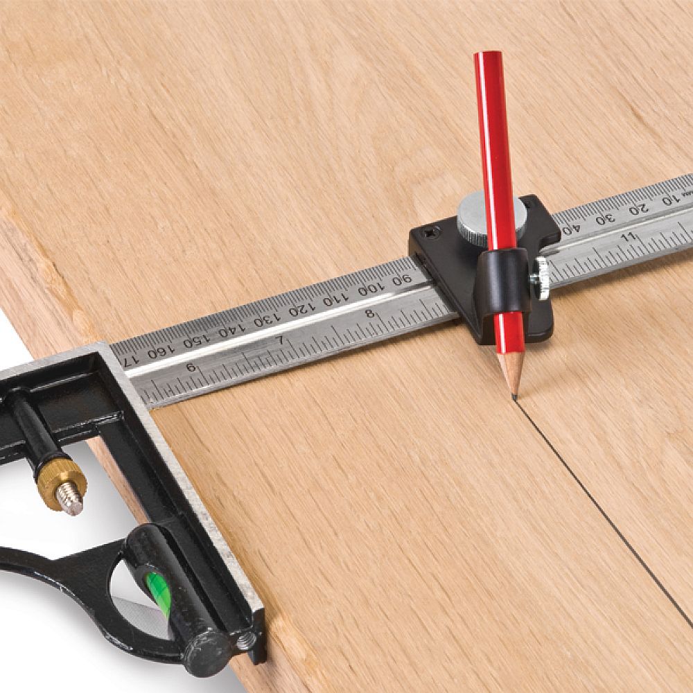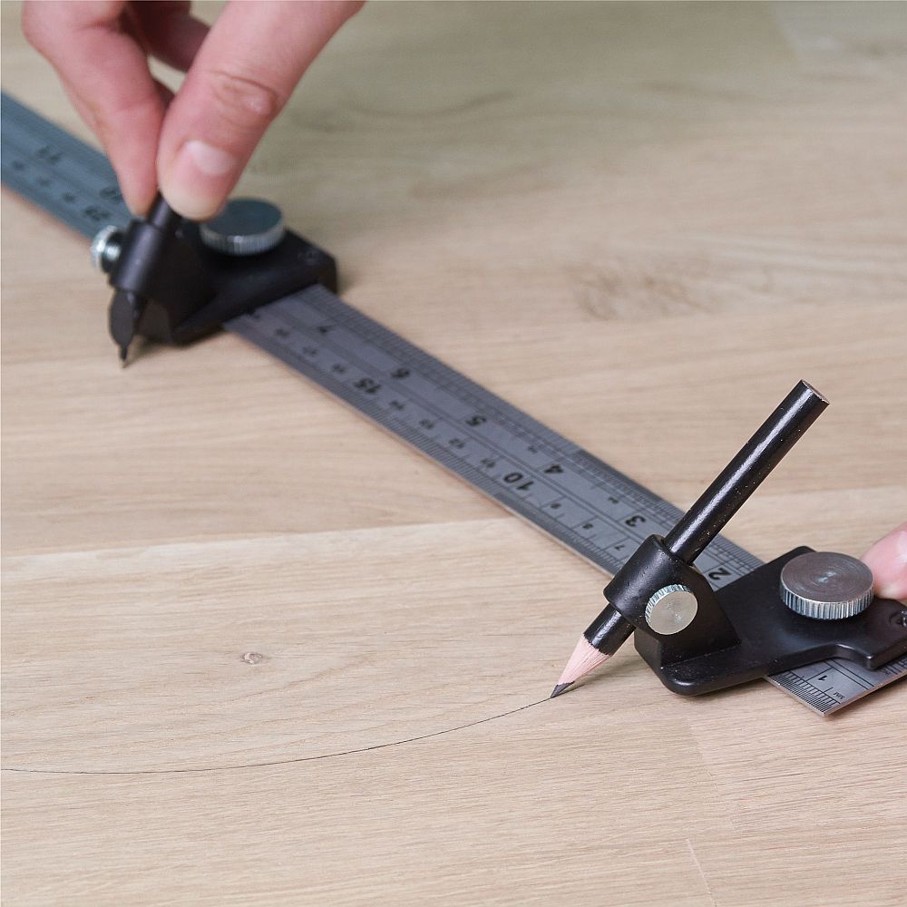 Kreise, Linien parallel zur Kante anreißen oder ausschneiden. Passt auf jedes Stahllineal ab 150 mm Länge, einer Breite bis 50 mm und Stärke bis 3 mm.